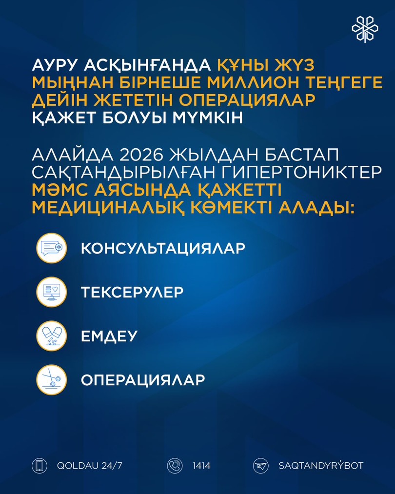 Дерт асқынған жағдайда құны миллиондаған қаржыны құрайтын күрделі операциялар қажет болуы мүмкін. 2026 жылдан бастап сақтандырылған азаматтарға артериялық гипертензияны емдеуге қажетті медициналық көмектің барлығы МӘМС есебінен көрсетіледі.