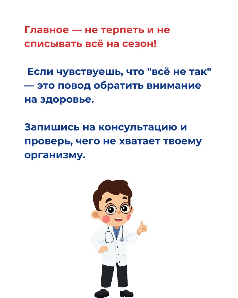 Запишись на консультацию и проверь, чего не хватает твоему организму.