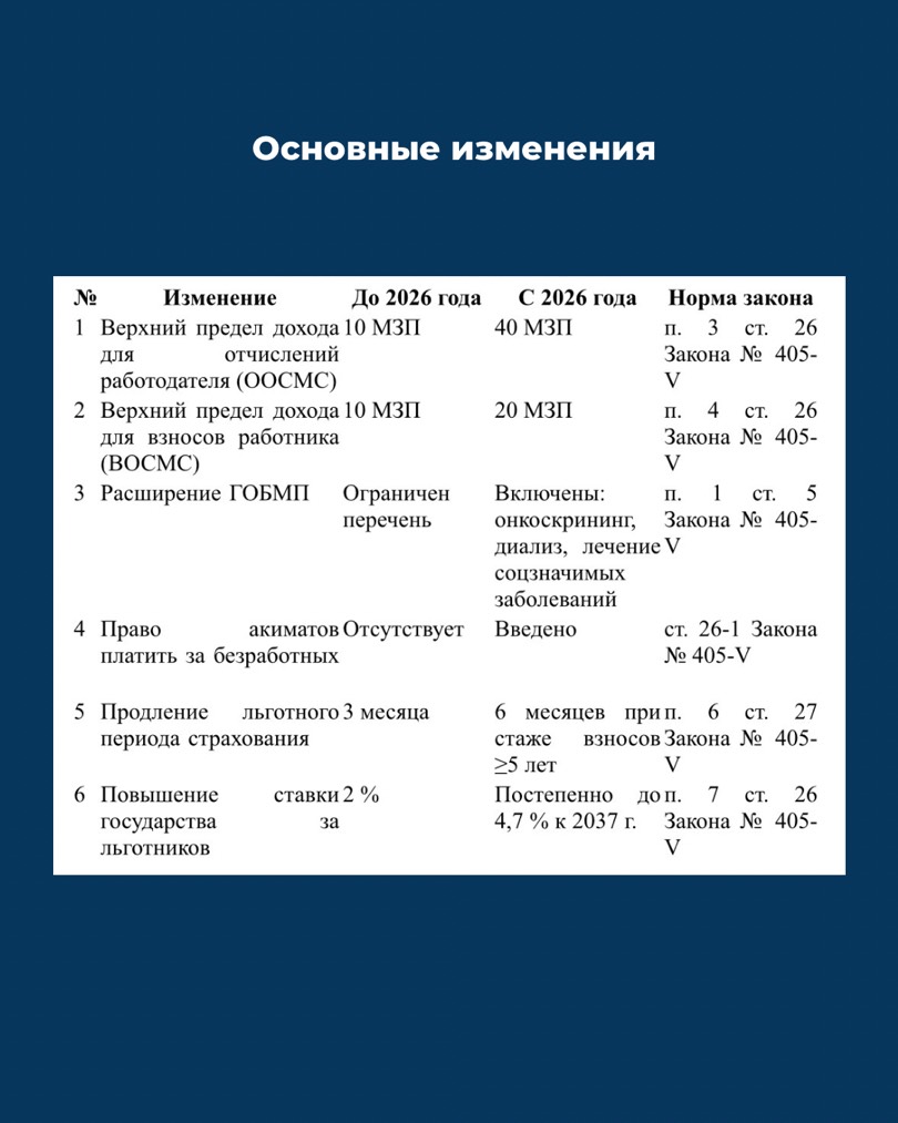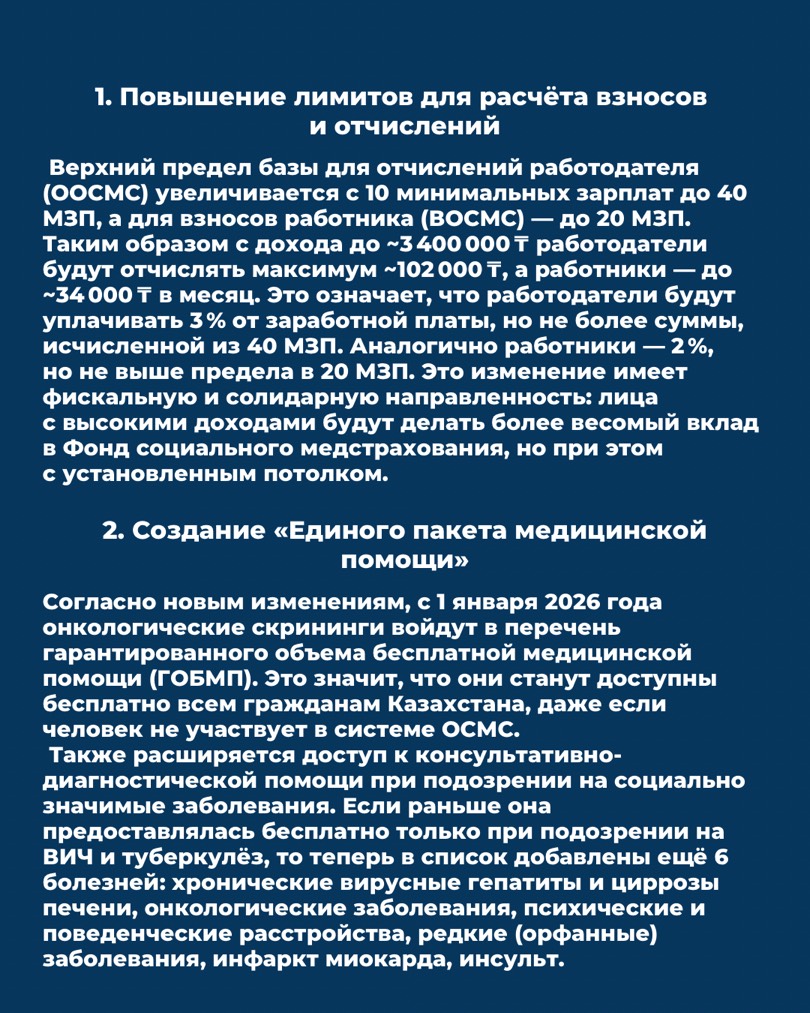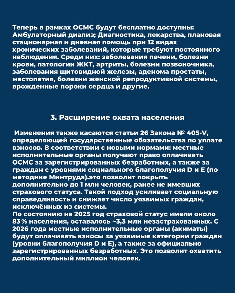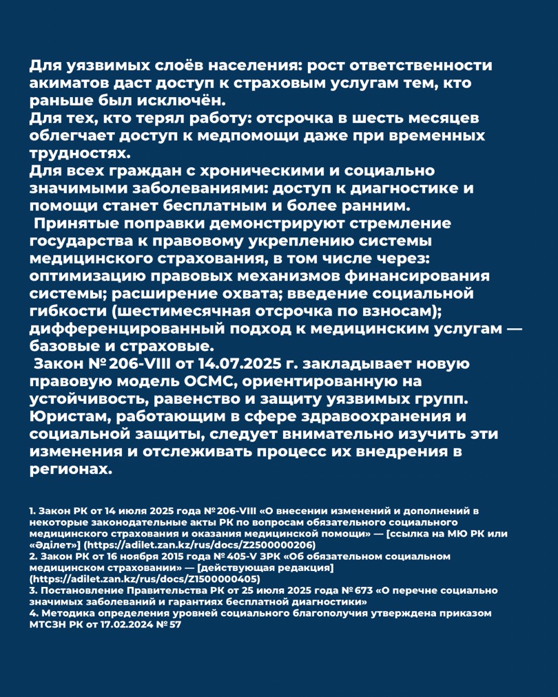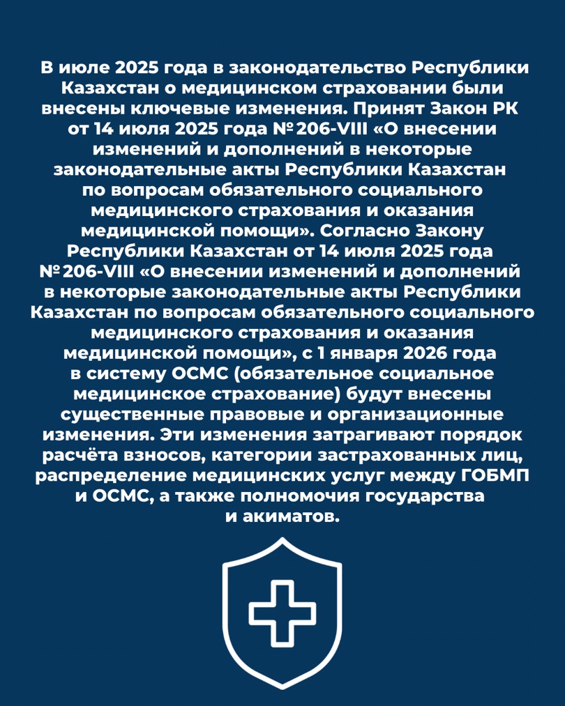 В июле 2025 года в законодательство Республики Казахстан о медицинском страховании были внесены ключевые изменения. Принят Закон РК от 14 июля 2025 года № 206-VIII «О внесении изменений и дополнений в некоторые законодательные акты Республики Казахстан по вопросам обязательного социального медицинского страхования и оказания медицинской помощи». Согласно Закону Республики Казахстан от 14 июля 2025 года № 206-VIII «О внесении изменений и дополнений в некоторые законодательные акты Республики Казахстан по вопросам обязательного социального медицинского страхования и оказания медицинской помощи», с 1 января 2026 года в систему ОСМС (обязательное социальное медицинское страхование) будут внесены существенные правовые и организационные изменения. Эти изменения затрагивают порядок расчёта взносов, категории застрахованных лиц, распределение медицинских услуг между ГОБМП и ОСМС, а также полномочия государства и акиматов.