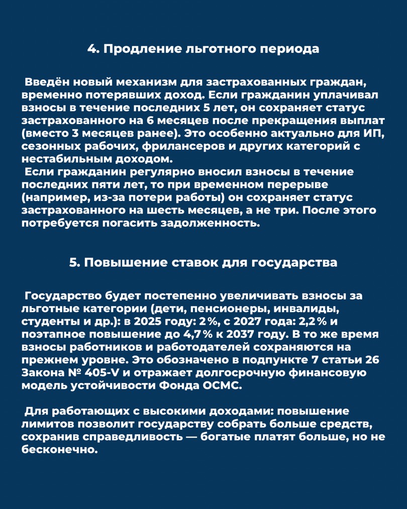 Государство будет постепенно увеличивать взносы за льготные категории (дети, пенсионеры, инвалиды, студенты и др.): в 2025 году: 2 %, с 2027 года: 2,2 % и поэтапное повышение до 4,7 % к 2037 году. В то же время взносы работников и работодателей сохраняются на прежнем уровне. Это обозначено в подпункте 7 статьи 26 Закона № 405-V и отражает долгосрочную финансовую модель устойчивости Фонда ОСМС.